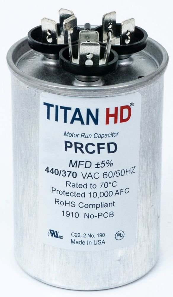 RoHS Compliant; Capacitor Shape Round; Can Dimension 2 Inch Diameter x 2.91 Inch Height; Voltage Rating 440/370 Volt AC 50/60 Hertz; Capacitance 30/7.5 Microfarad; Can Material Aluminum; Oil Type Soybean Based; Terminal Type Standard Blade; Temperature Ra